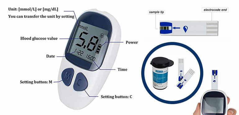 Blood Glucose monitor / meter (or glucometer) is a medical device for determining the approximate concentration of glucose in the blood. It can also be a strip of glucose paper dipped into a substance and measured to the glucose chart. It is a key element of home blood glucose monitoring (HBGM) by people with diabetes mellitus or hypoglycemia. A small drop of blood, obtained by pricking the skin with a lancet, is placed on a disposable test strip that the meter reads and uses to calculate the blood glucose level. The meter then displays the level in units of mg/dl or mmol/l.